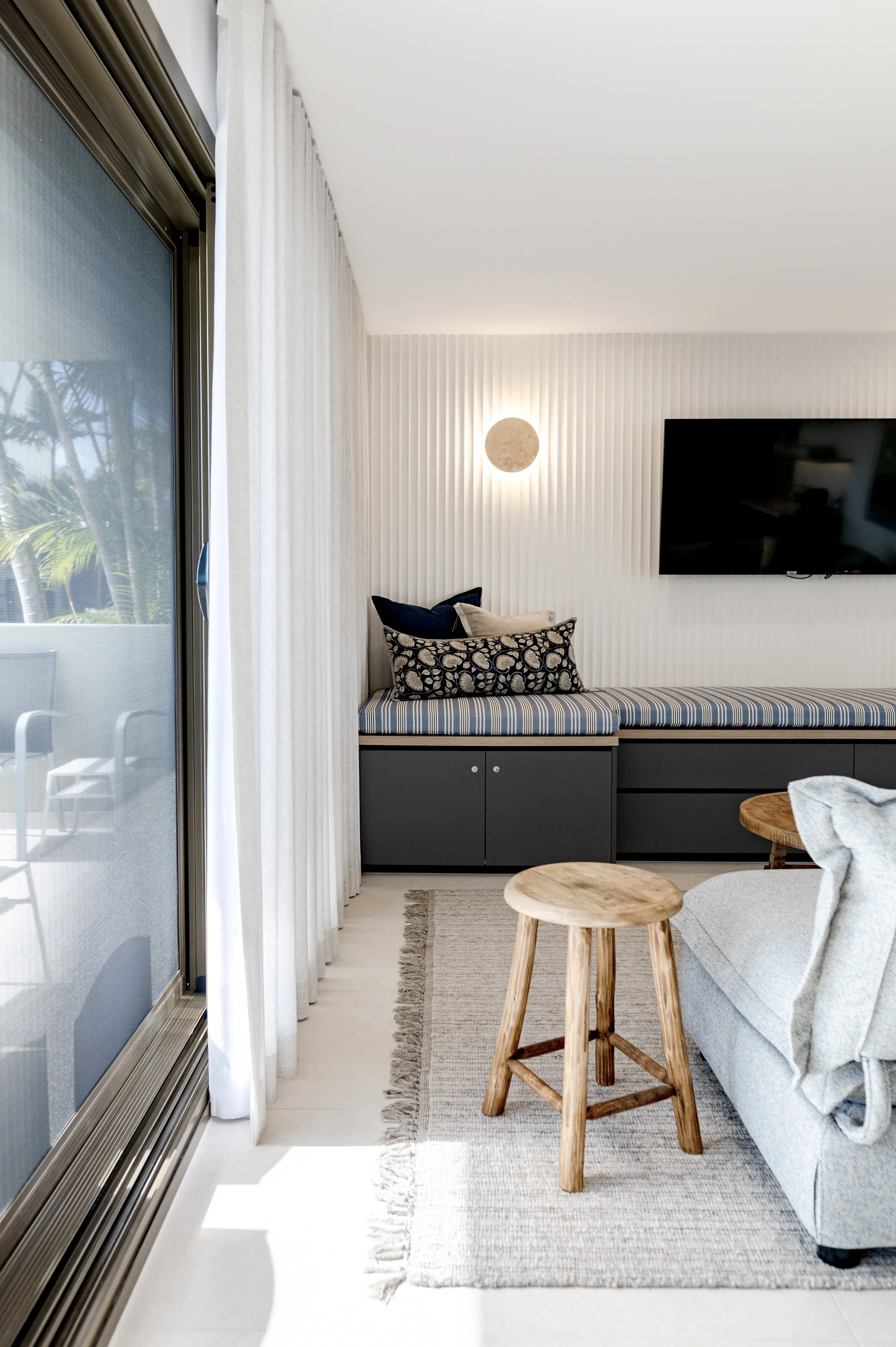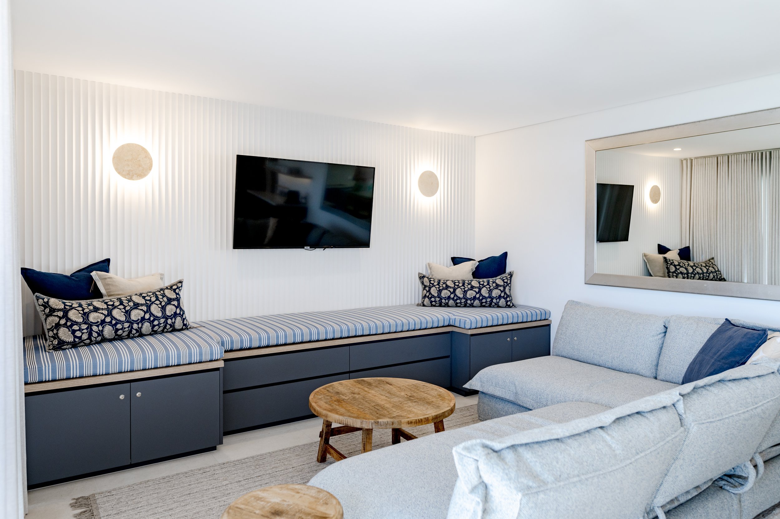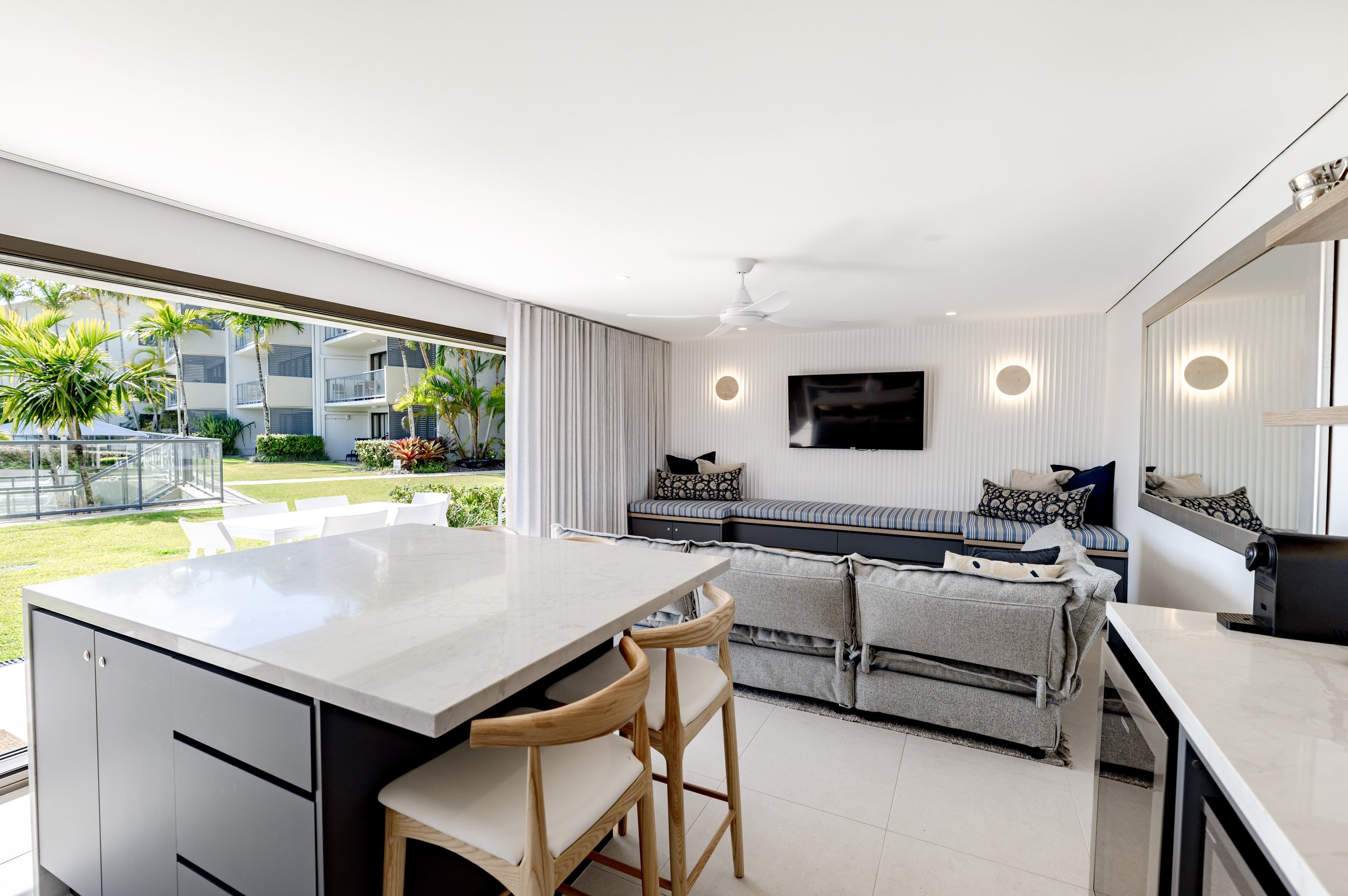 Noosa Holiday House showcases Collins Building Designs ability to transform what was once a small and restricted holiday rental into a space that has a large and open feel. In this design we removed the dining table and added an island bench that can double as a dining table to extend the kitchen. The TV unit was replaced with a booth seat that allows for lockable storage and can be used as a temporary bed. Finally, we added an entrance bench/ hooks and shelf that allows for a discrete location to store shoes and quick access to hats/ coats and towels. We were thrilled with this projects transformation and how our trades were able to finish this project to a high standard.