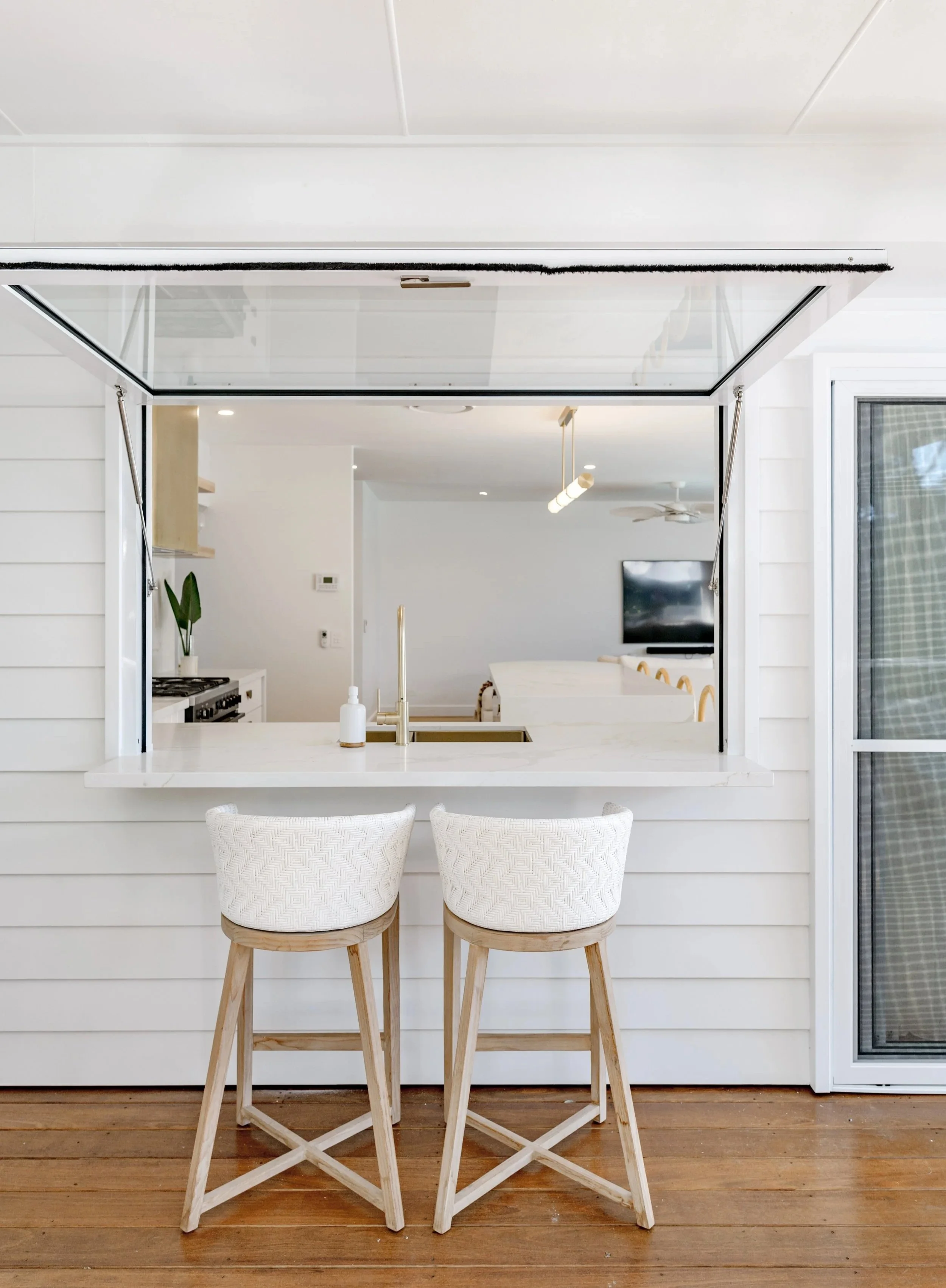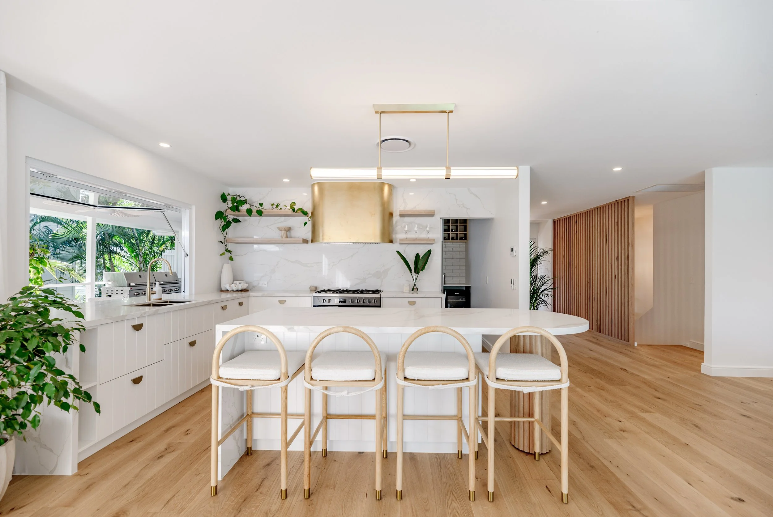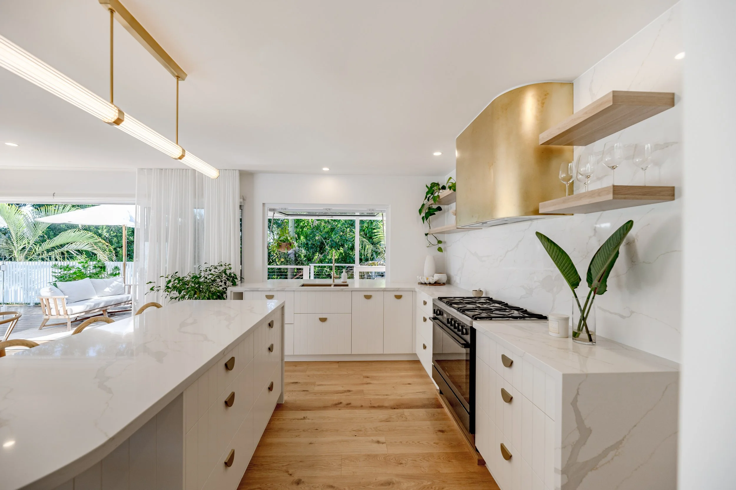 Our Tropical Retreat project is a great showcase of our clients modern and playful brief. This project incorporated many custom features such as a curved gold kitchen range hood, a pool lounge island and an oversize entry door. We really tried to keep the spaces open and light with as much focus on the external environment as possible. Our client was thrilled with this renovations outcome and is a great showcase of our renovation capabilities.